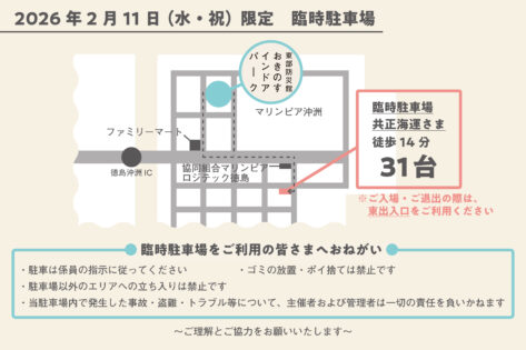 また、弊施設の駐車場、臨時駐車場が満車の場合は、大変恐れ入りますが「沖洲マリンターミナル駐車場(有料)」をご利用ください。