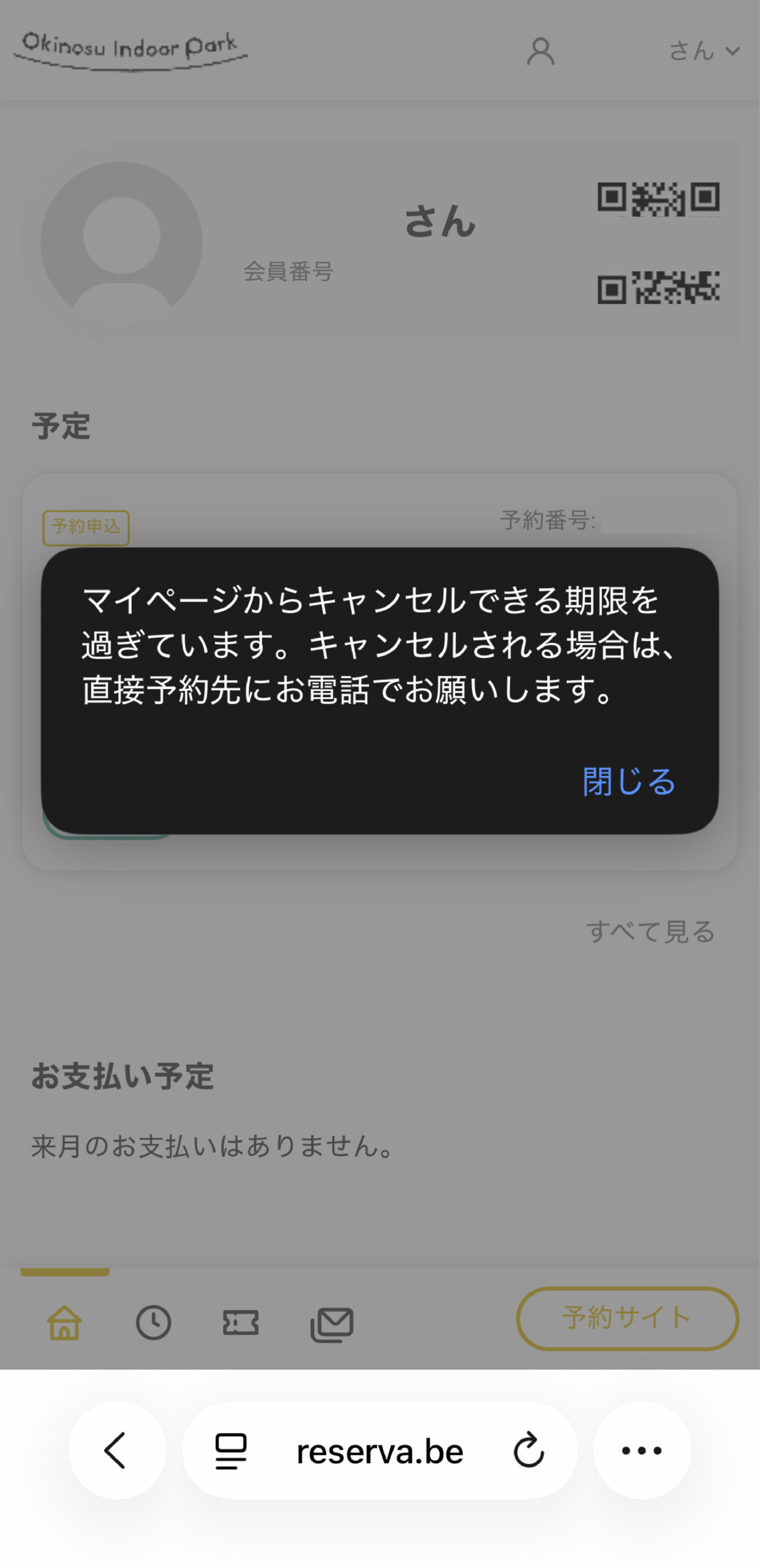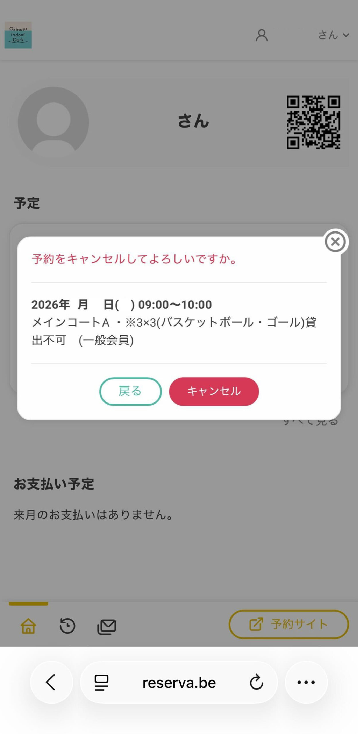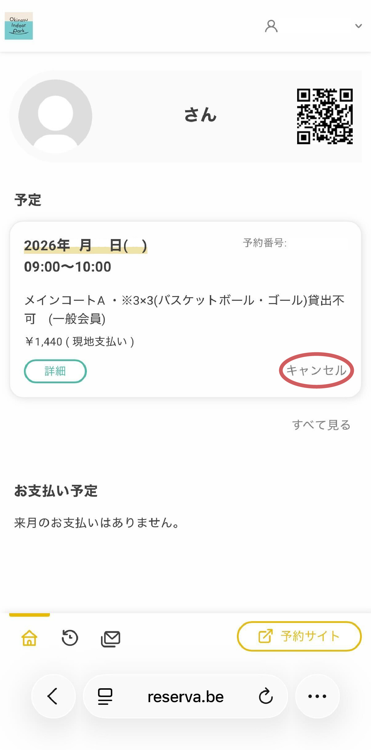 ②マイページの予約「予定」リストから、該当予約を選択すると、キャンセルボタンが表示されますが、