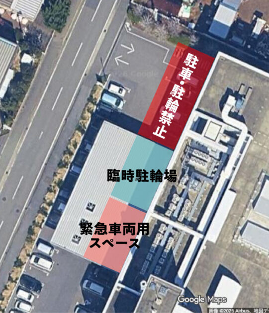 臨時駐輪場および、一部閉鎖駐車場は下記画像をご覧ください。